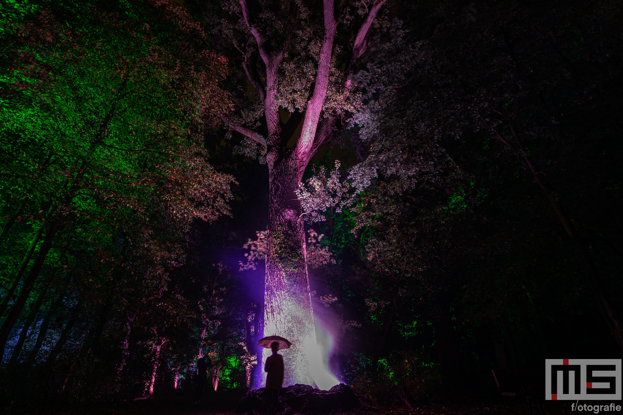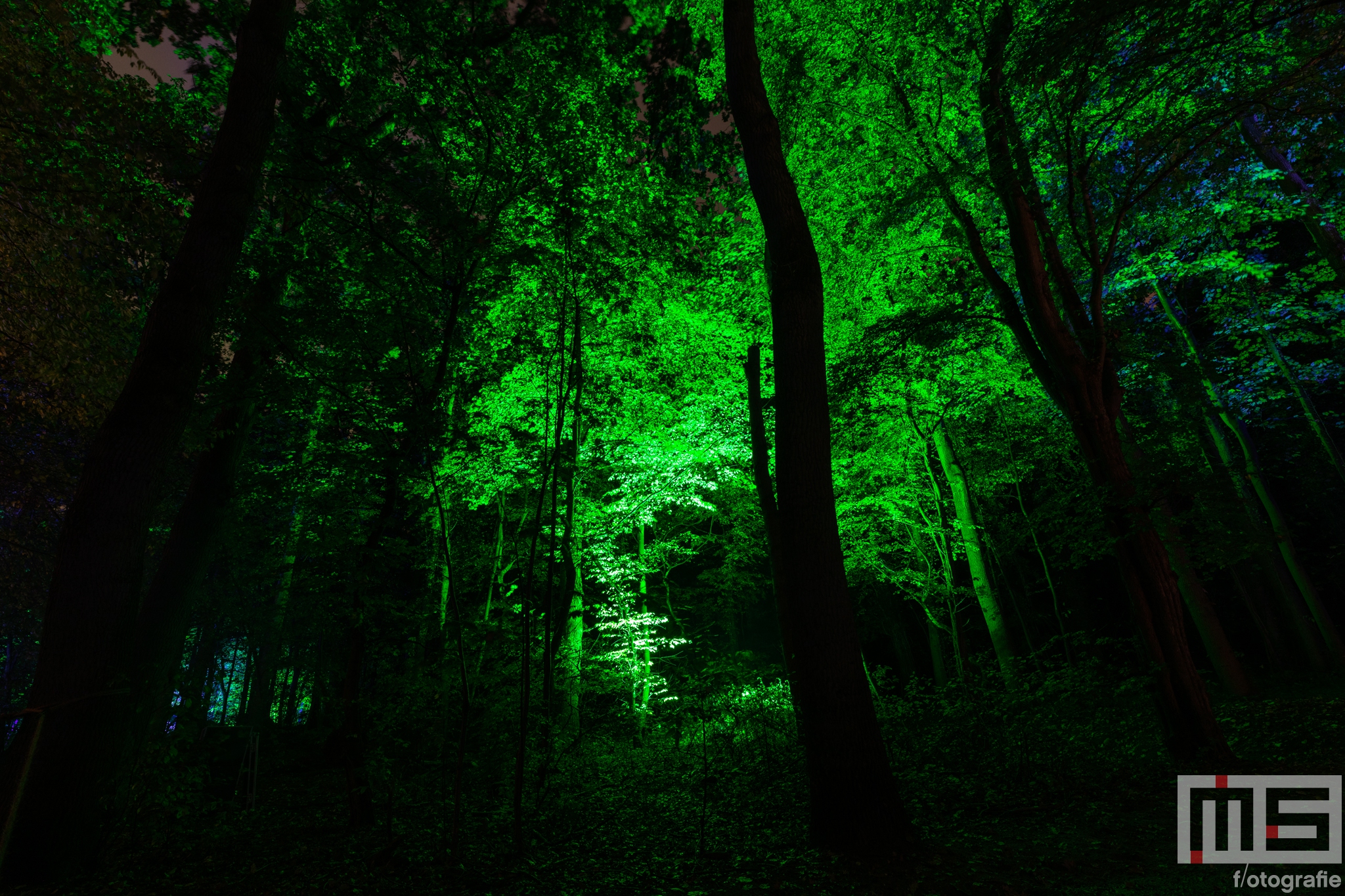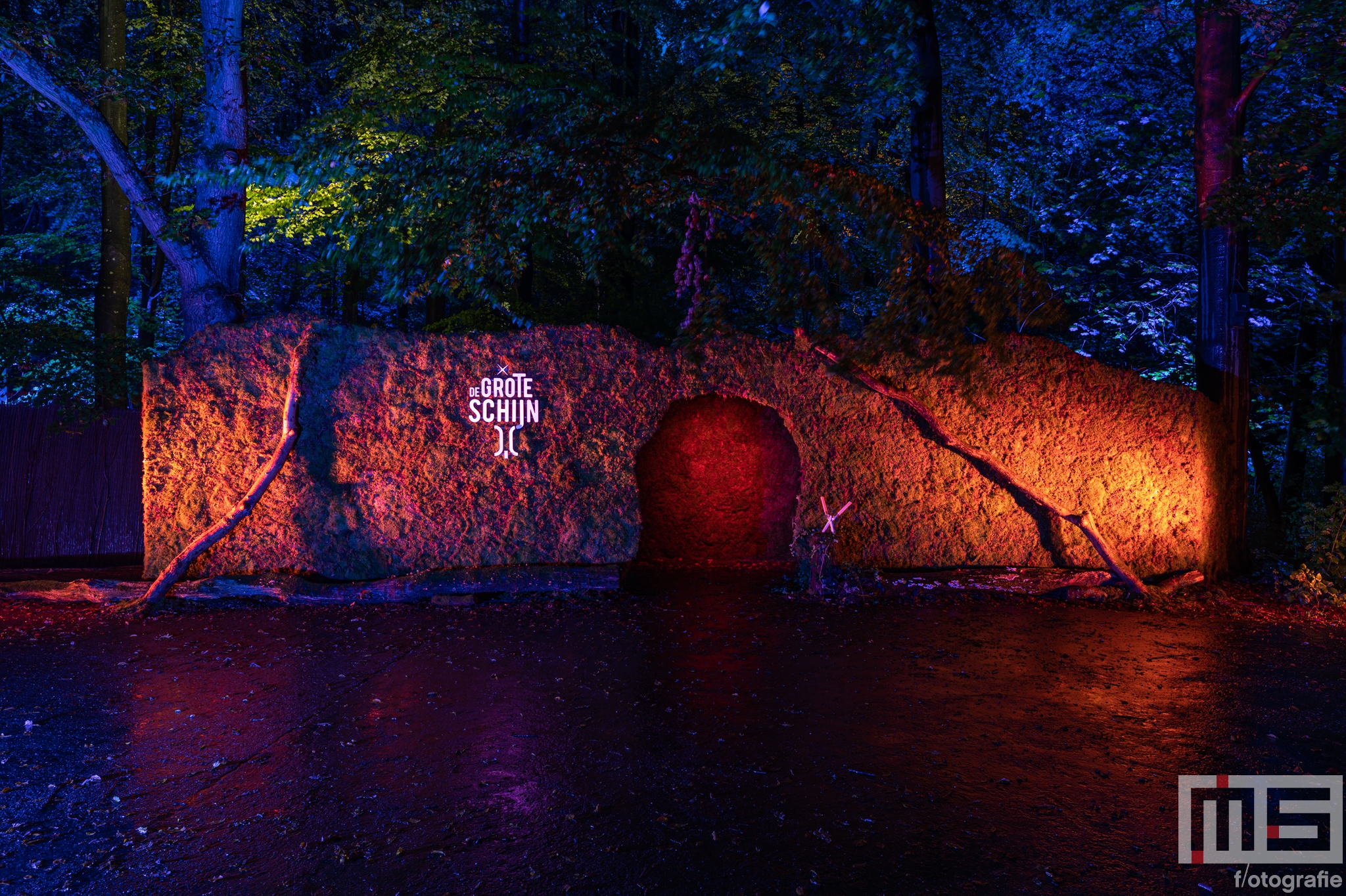 We lopen een aantal stappen het bos in en worden gelijk bevangen door een groene en blauwe gloed. Op de achtergrond horen we fluisterende bomen, betoverende klanken en zien fascinerende lichtprojecties. In het midden van de route van De Grote Schijn komen we bij een mystische boom wat om de paar seconde van kleur verschiet. Het trekt veel mensen die graag met de boom op de foto willen. Iets verder in het bos zijn lichtgevende paddenstoelen en lichtslangen te vinden wat als ware natuurlijk ademt.