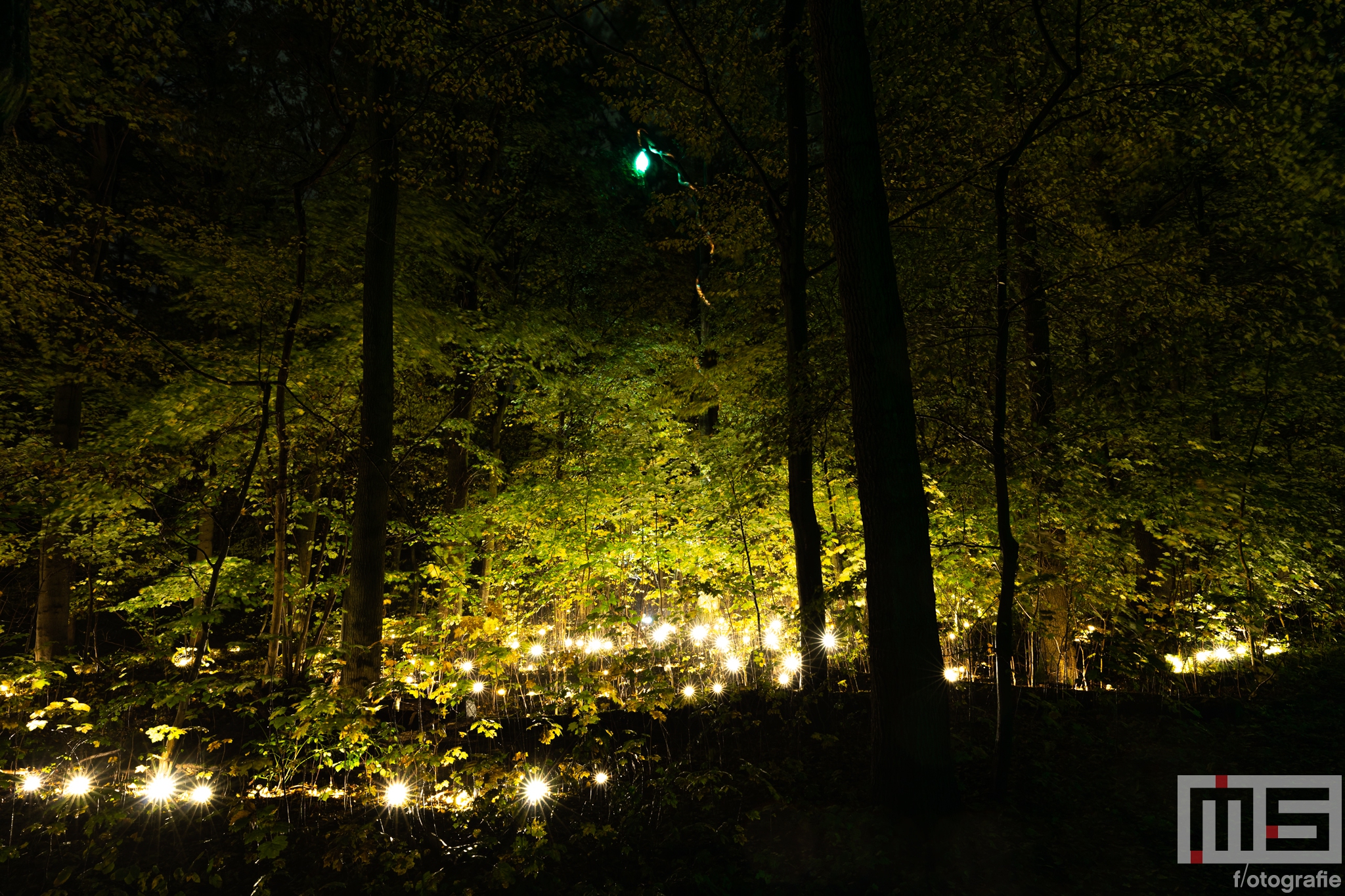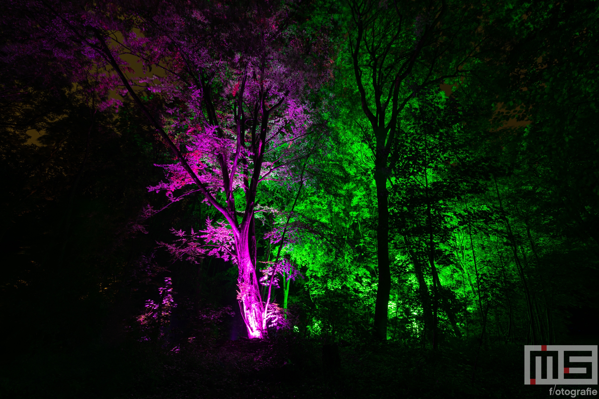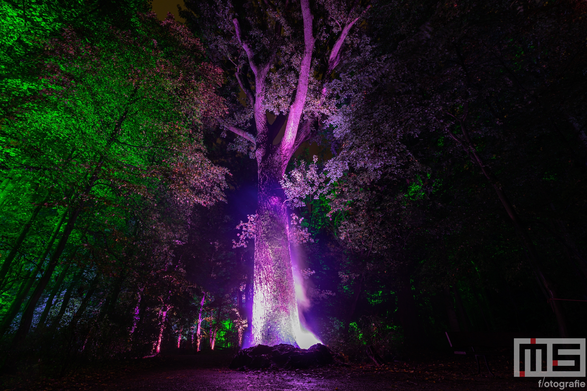 We lopen een aantal stappen het bos in en worden gelijk bevangen door een groene en blauwe gloed. Op de achtergrond horen we fluisterende bomen, betoverende klanken en zien fascinerende lichtprojecties. In het midden van de route van De Grote Schijn komen we bij een mystische boom wat om de paar seconde van kleur verschiet. Het trekt veel mensen die graag met de boom op de foto willen. Iets verder in het bos zijn lichtgevende paddenstoelen en lichtslangen te vinden wat als ware natuurlijk ademt.
