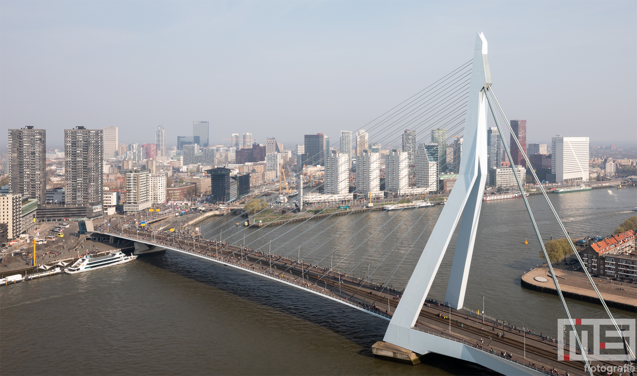 Ook dit jaar hadden wij weer een geweldig uitzichtpunt op de Erasmusbrug met alle lopers en bezoekers. Op de achtergrond waren ook de sierspuiters van het Havenbedrijf aanwezig, waarvan de beelden altijd via de televisie de gehele wereld overgaan.