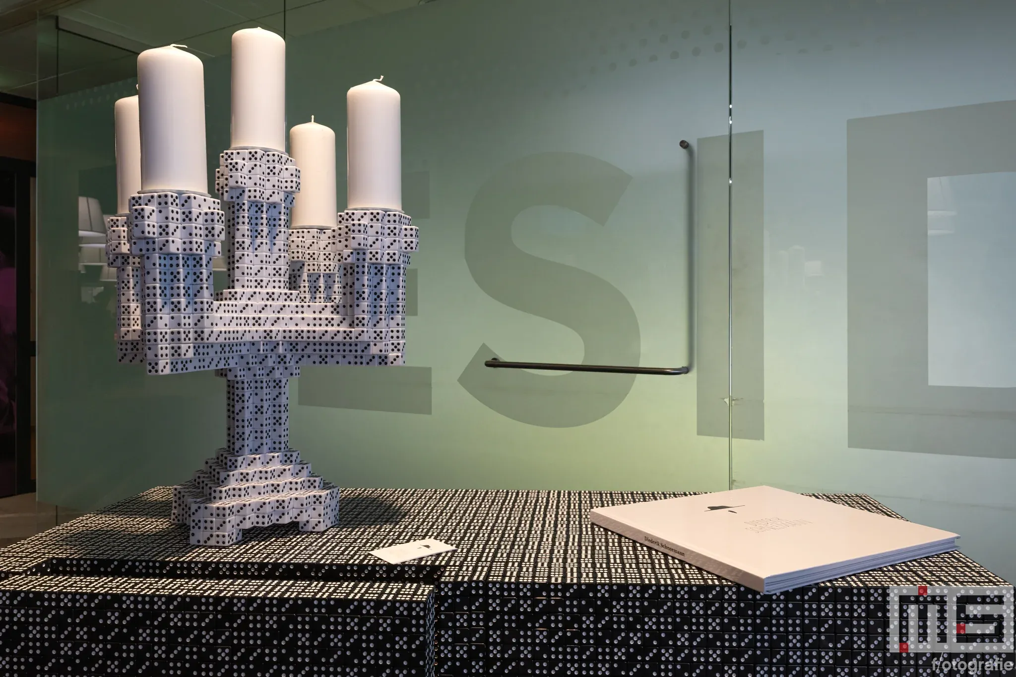 We vervolgden onze weg naar de eerste verdieping, waar we als eerste Emma Werkhoven tegenkwamen. Zij verwerkt haar voorliefde voor leer in onder meer verfijnde lampen en andere objecten. Ook zagen we daar weer de lampen van Aptum. Even later stuitten we opnieuw op een bekende van Art Rotterdam vorig jaar: Diederik Schneemann met zijn dobbelsteenkunst. Het bijzondere aan zijn werk is het verhaal erachter. Hij gebruikt uitsluitend dobbelstenen waarmee hij zelf zes heeft gegooid. Elke tafel, kandelaar of tas die hij maakt, moet zo letterlijk voortkomen uit een geluksmoment.