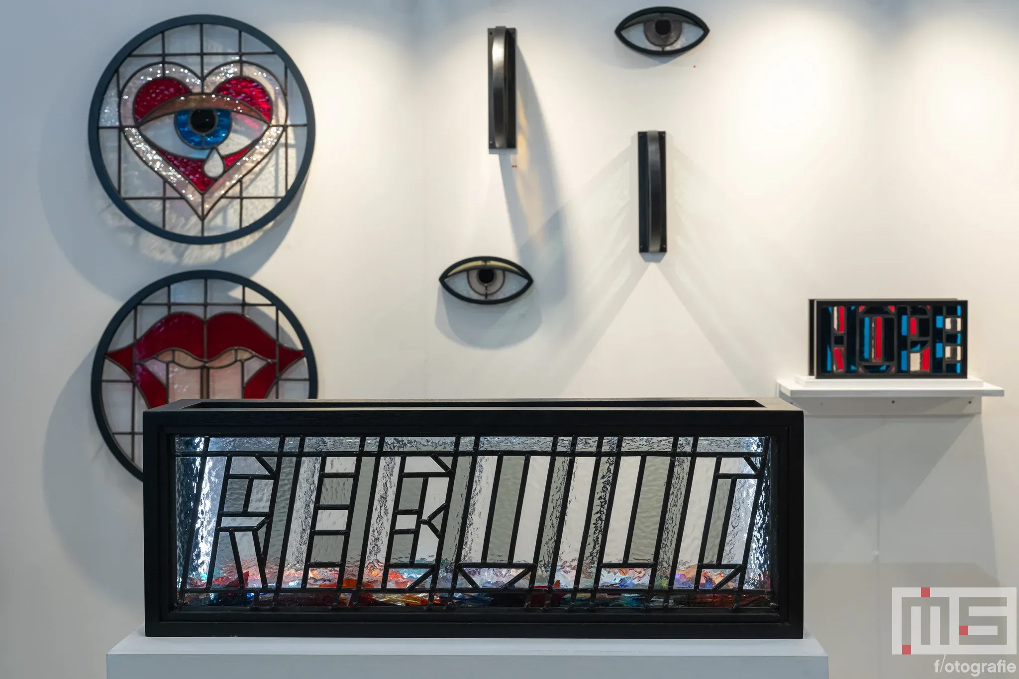 Aansluitend presenteerde Rebuild een serie karaktervolle glas-in-loodwerken die zeer in trek waren bij het aanwezige publiek. Vlak voordat we de hogere verdiepingen verkenden, zagen we een vertrouwde naam terug: Iwan Smit, die we eerder tegenkwamen in het HAKA-gebouw. Zijn lichtsculpturen trokken opnieuw de aandacht; het zijn werken die blijven intrigeren door hun subtiele spel van vorm, materiaal en licht.