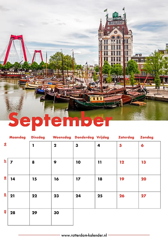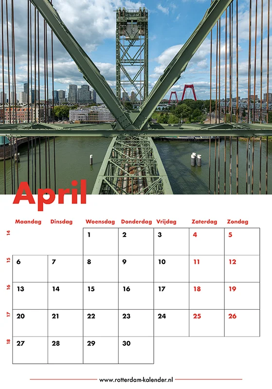De Rotterdam Kalender 2026 is ook te gebruiken als jaarkalender en/of notitiekalender door middel van de ruime vakken (2,1 x 2,9 cm) per dag. Via deze online shop of onze Bol.com webwinkel is hij online te koop voor EUR 13,95 (excl. EUR 4,95 verzendkosten in Nederland).