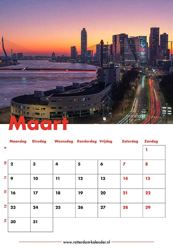 Op deze pagina vind u de jaarlijkse Rotterdam Kalender 2026 van MS Fotografie met 13 schitterende foto’s gemaakt door stadsfotograaf Marc van der Stelt. De kalender is een echte blikvanger aan de muur voor elke Rotterdam liefhebber.