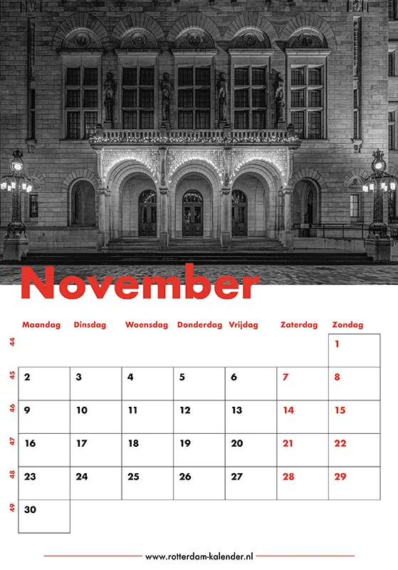 - November – Het stadhuis van Rotterdam met sfeerverlichting in zwart/wit